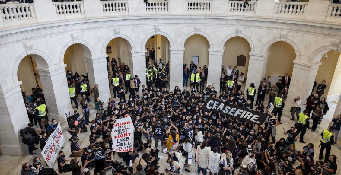 Demonstrators, calling for a ceasefire in the ongoing war between Israel and Hamas, chant and hold banners during a protest inside the Cannon House Office Building at the Capitol in Washington on Wednesday, Oct. 18, 2023. (AP Photo/Amanda Andrade-Rhoades)